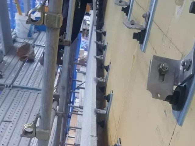 下面這幾張照片是同類的施工工藝,保溫材料采用了巖棉板,也覆蓋了防水層,板縫之間還用了發泡聚氨酯填縫。當然,這個是有主次龍骨了,繼續讓人腦洞大開的他們用于固定龍骨的角鐵居然也是直接安裝在保溫板的表面!
